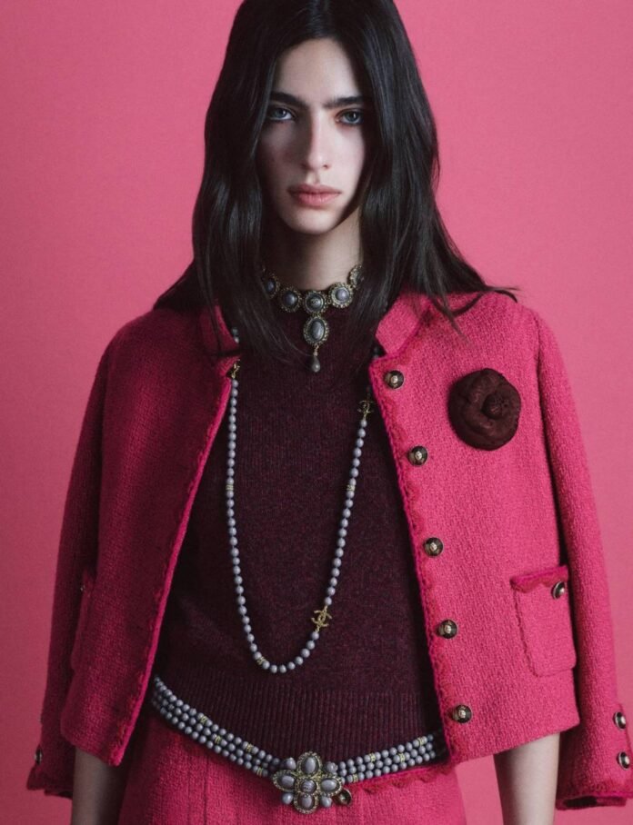 وتبرز أنماط شانيل لتبدو أشبه بلوحات مفعمة بالحيوية إذ يسلط اللونان الأسود والأبيض الضوء على الخطوط الغرافيكية للبدلات والمعاطف والسترات، المزينة بقبعات التويد من صانع القبعات ميزون ميشيل وزهور الكاميليا من تصميم ليمارييه.